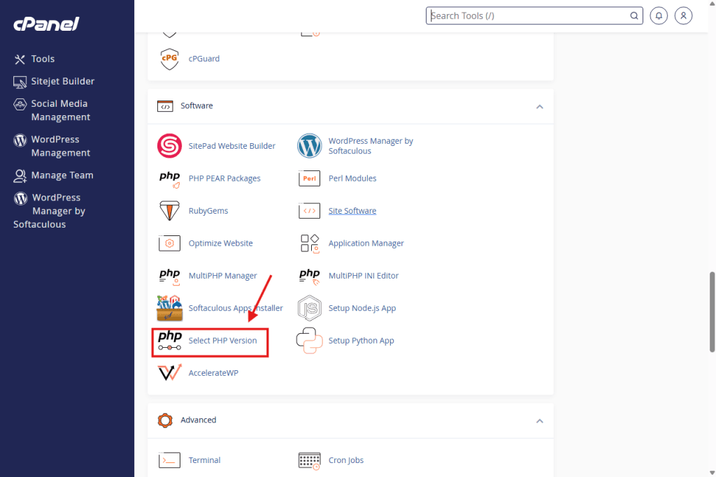 • Note: Do not click “MultiPHP Manager” if you see it. “Select PHP Version” is the correct tool for your account.