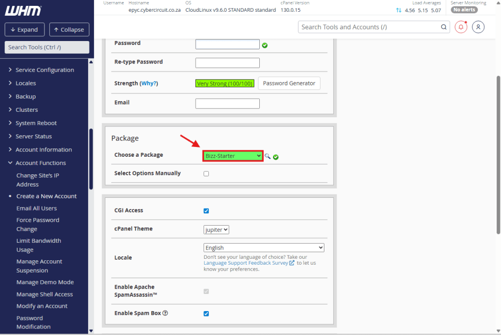 Username: Click inside this box, and WHM will automatically create a username for you. You can change it, but it must be short (max 8-16 characters).