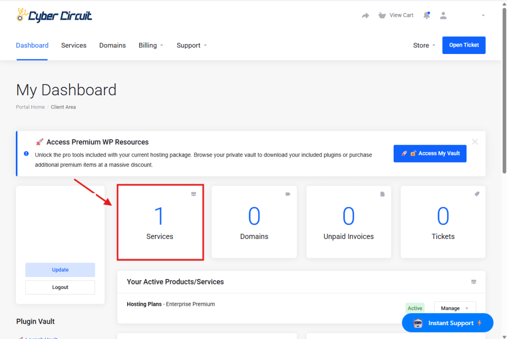 - On your dashboard, locate and click the Services tab. This will open a list of your active hosting packages and products.