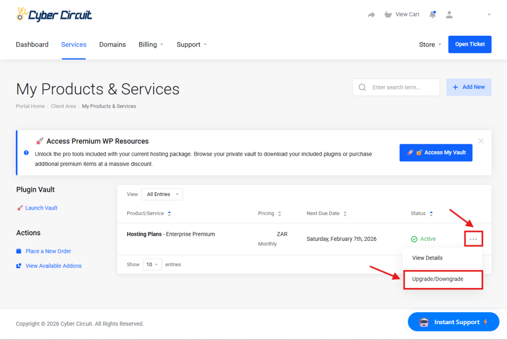 On the “My Products & Services” page, locate your active hosting plan. Click the three-dot menu icon (⋯) on the far right of the row and select Upgrade/Downgrade from the dropdown menu.