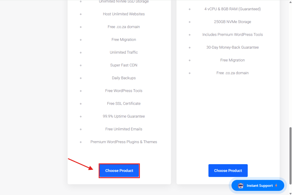 You will now see a list of available plans under New Configuration. Compare the features and pricing of each plan, then click the Choose Product button for the one that best fits your needs.